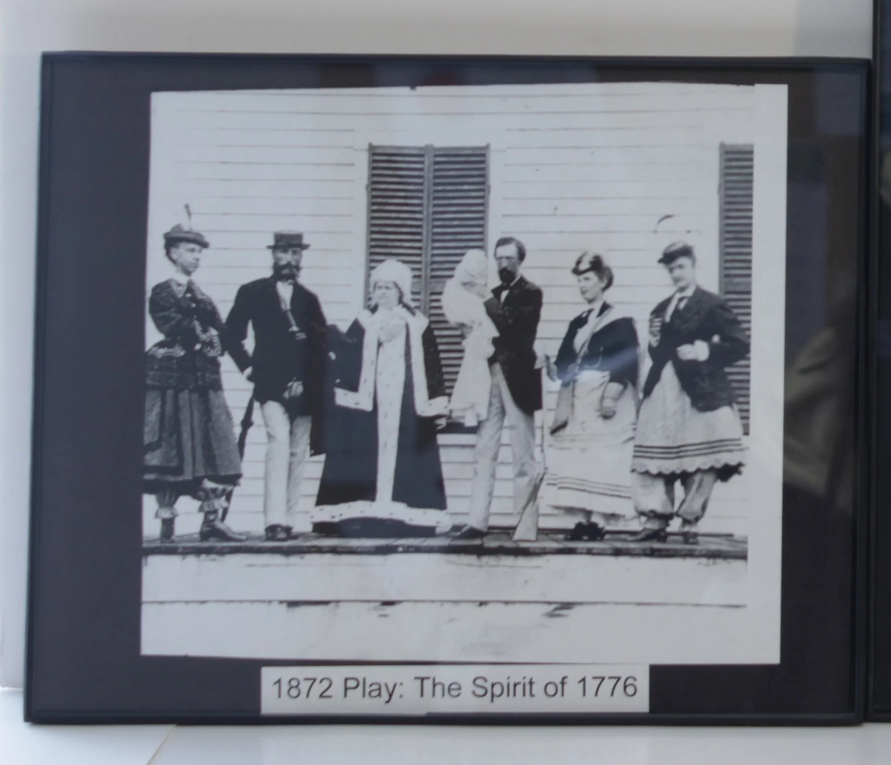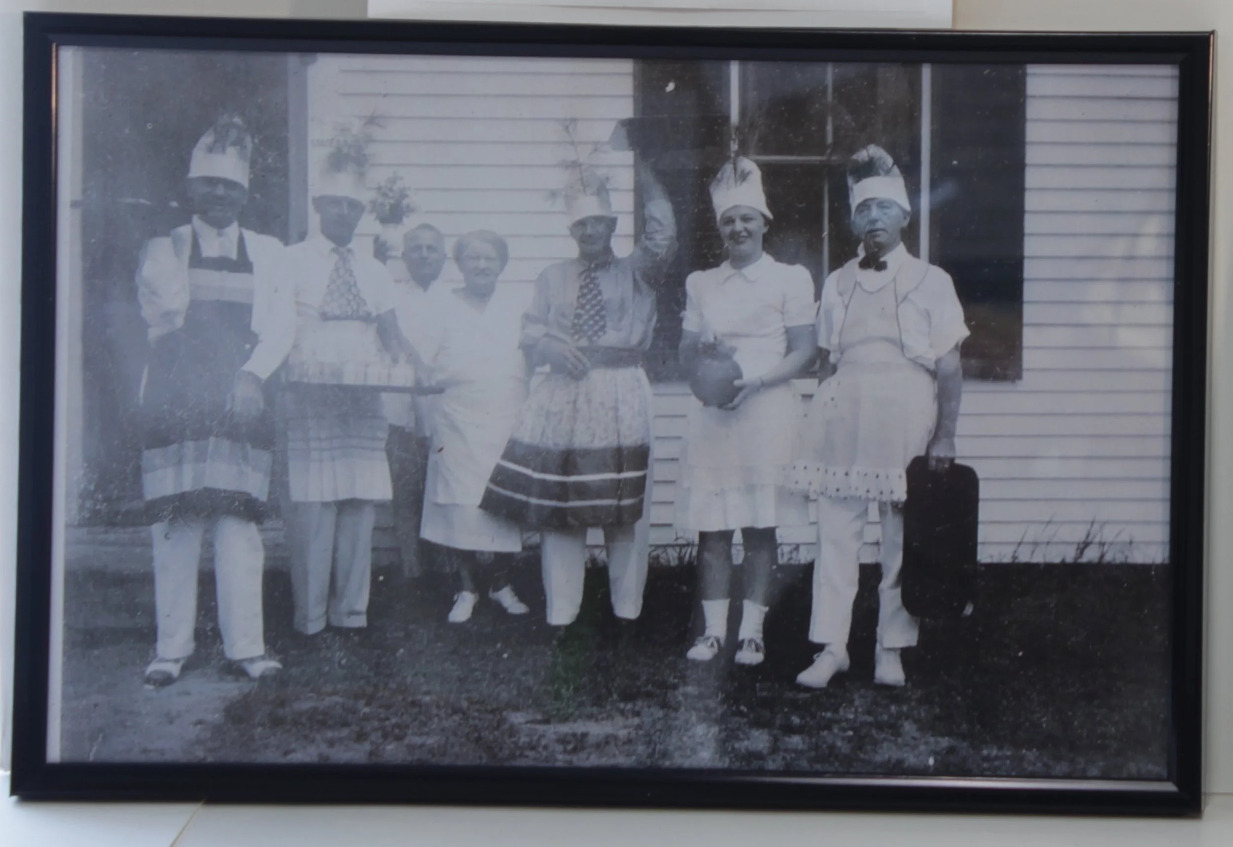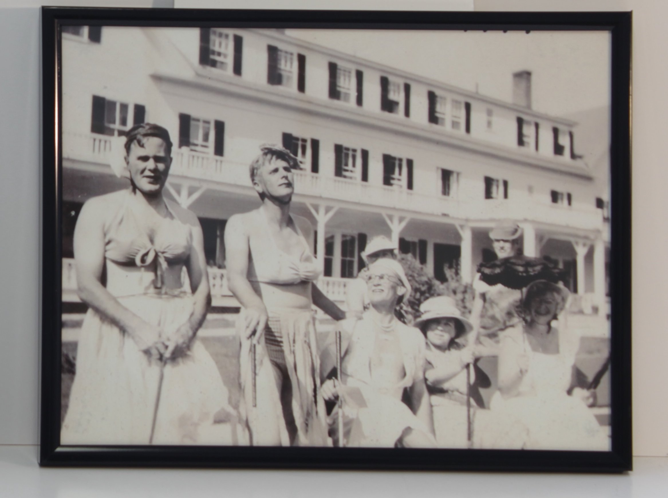 Framed photo, 1949 “Dressed in Drag”, L-r Gerard McNutt, Stephen McNutt, Warren Mansfield, Mrs. Bassett, Augusta Patton. Donated by Jerauld Adams