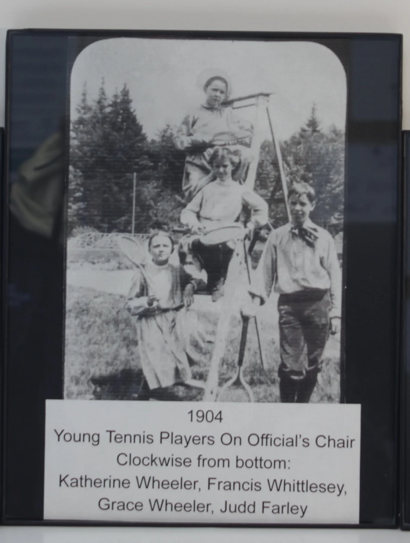 1904 Young tennis players on Official’s Chair, Katherine Wheeler, Francis Whittlesey, Grace Wheeler, Judd Farley