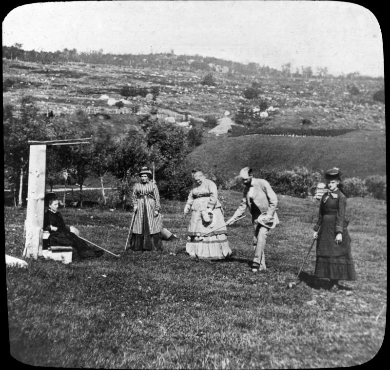 Croquet Photo, 1872, l-r Mary Bachelder, Mrs. N.S. Bachelder, Mary Briggs, Frank Briggs, Alice Fletcher